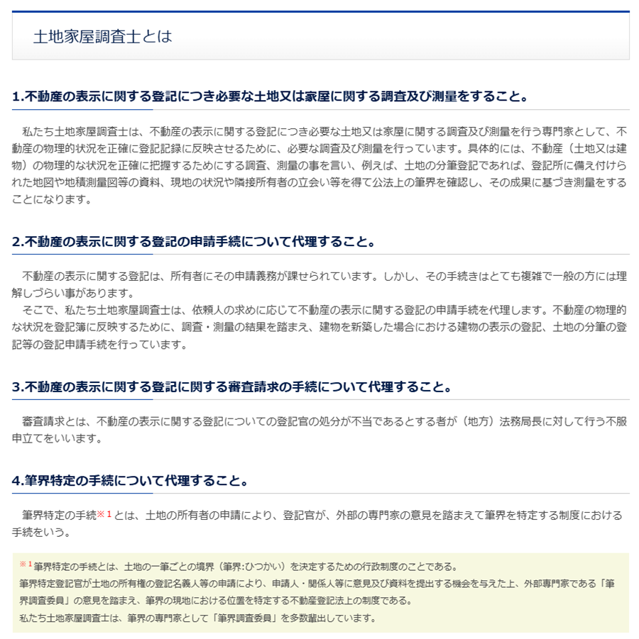 下に日本土地家屋調査士会連合会さんが作成した「土地家屋調査士について」https://www.chosashi.or.jp/investigator/about/を抜粋して提示しております。