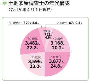 令和5年4月1日時点では、土地家屋調査士として働いている方は約15,000人ですが、最も割合の大きい年齢層は、